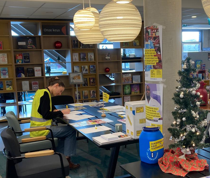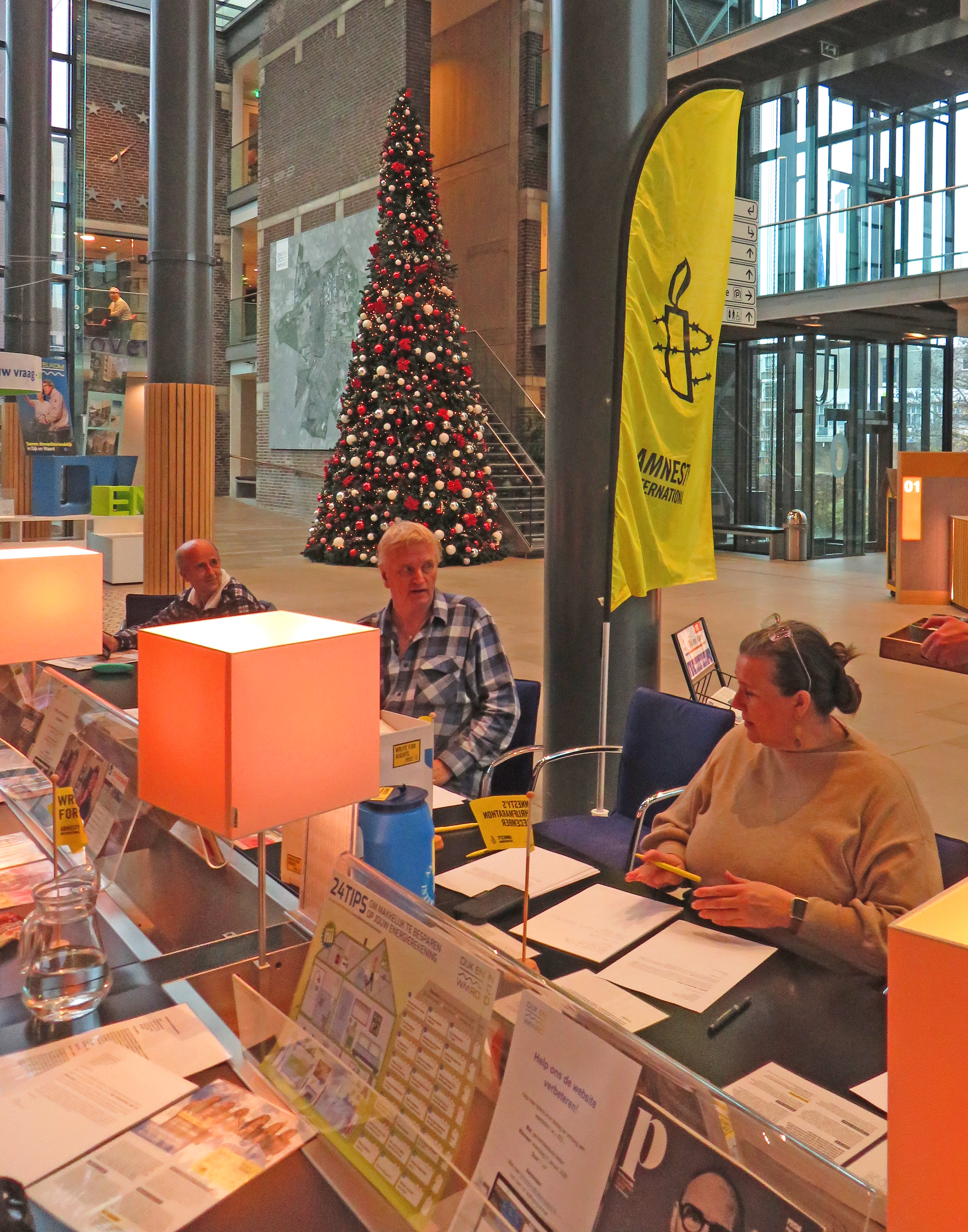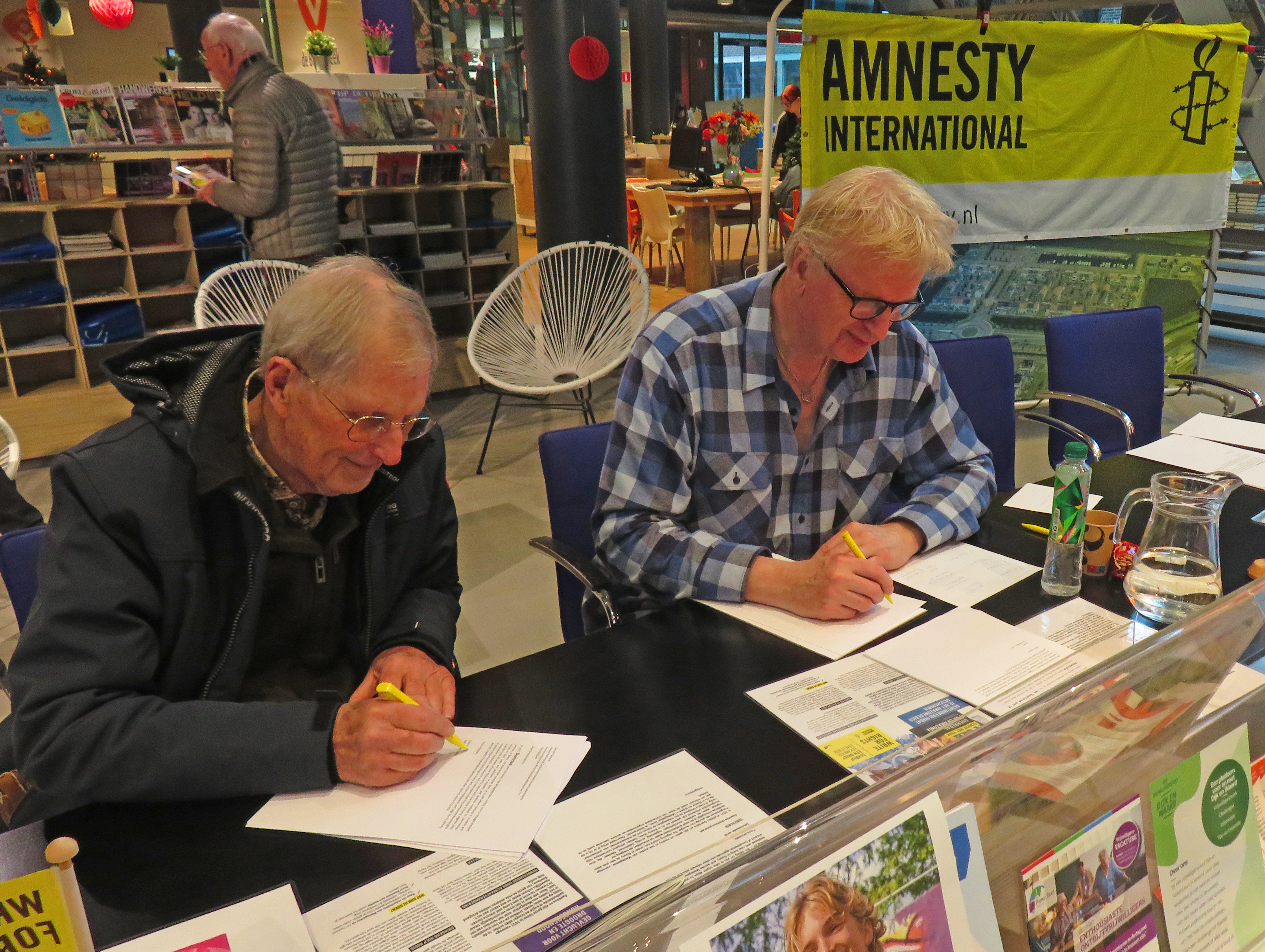 Dit jaar waren leden van onze groep actief in De Binding in Langedijk, de Bibliotheek/gemeentehuis in Heerhugowaard en in De Brink in Obdam. En ook veel mensen die in de buurt waren, kwamen even langs om een brief te schrijven, een handtekening te zetten en ook een groetenkaart te maken.